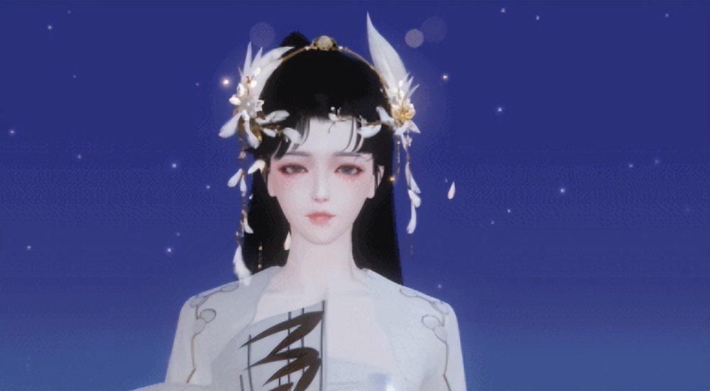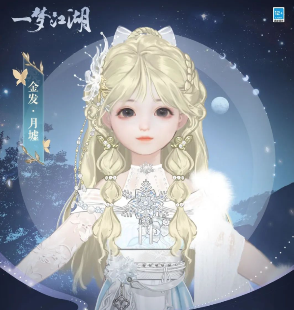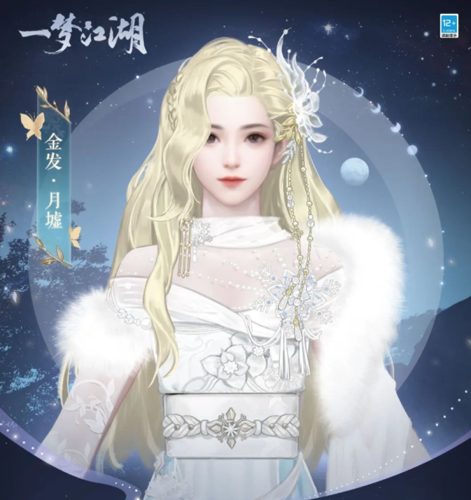 再看這邊女俠款月墟.......金發如瀑而下,鬢邊別著一朵晶瑩剔透的冰花,層疊花瓣舒展開來,好似月華凝於發間。而發間綴著的珍珠更似采擷月光凝成的一般,顆顆圓潤彷彿天邊月,給女俠平添幾分貴氣!