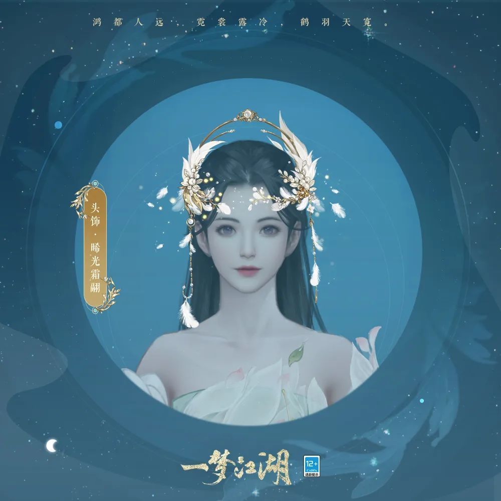 除了金發·月墟以外,頭掛·晞光霜翮也將華美登場!頭掛·晞光霜翮以日出時於山頂沐光起舞的仙鶴為靈感,將柔軟鶴羽和金飾珍珠相混搭,組成一個別緻的花環,綴於少俠發間!潔白羽毛恰似仙鶴舞翎,而金飾和珍珠就好像具象化的日光,灑在鶴羽之上,純潔又華美!再定睛一看,花環周圍還有細碎的羽毛飄落,平添幾分溫柔聖潔~這要是搭配純白衣衫,定似畫中謫仙走出來一般~