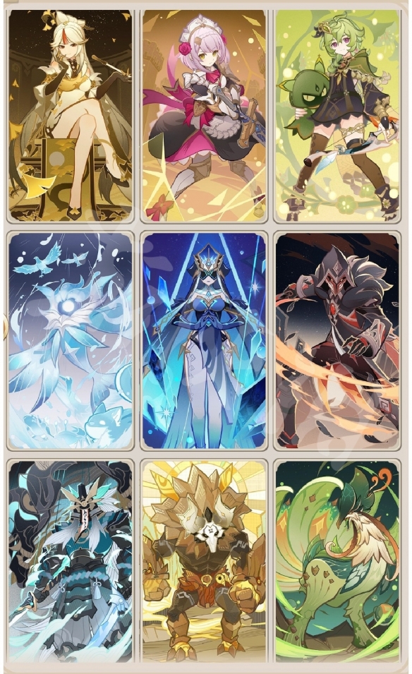 目前游戲中的角色牌有:甘雨,芭芭拉,行秋,神里綾華,莫娜,迪奧娜,重雲,凱亞,迪盧克,菲謝爾,香菱,宵宮,雷澤,砂糖,賽諾,班尼特,刻晴,琴,凝光,純水精靈,魔偶劍鬼,柯萊,債務處理人,丘丘王,藏鏡仕女,諾艾爾,翠翎恐蕈。