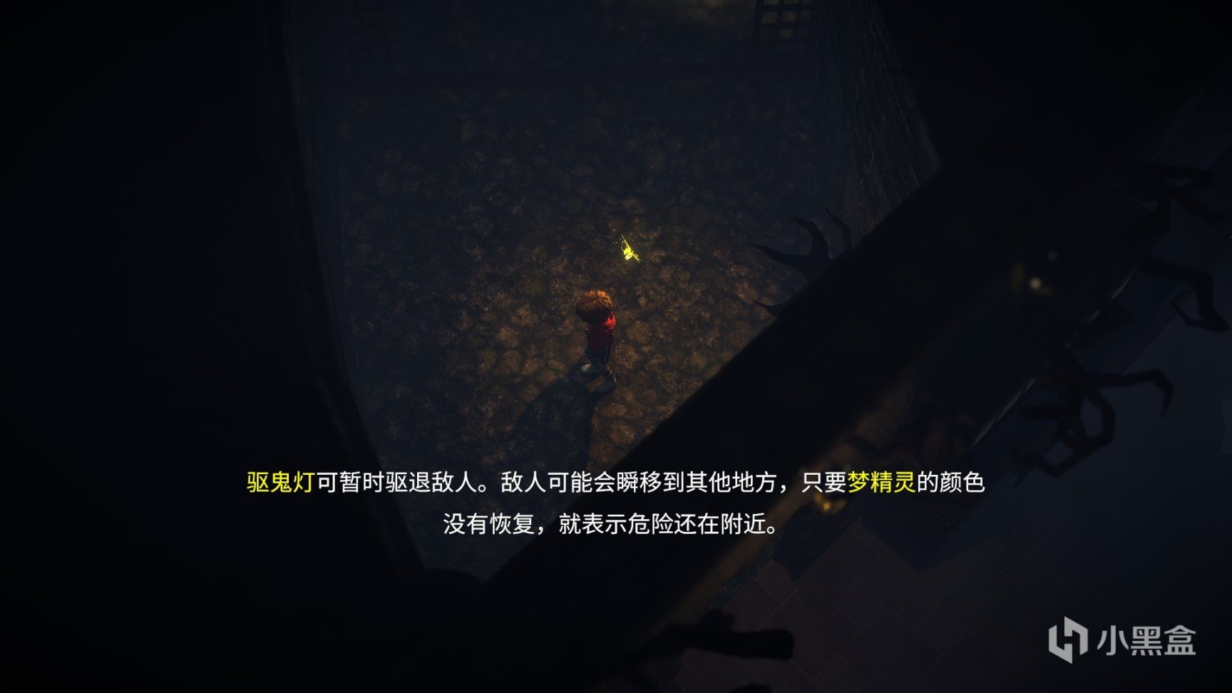除此之外,這款游戲還為我們提供了一個蝴蝶形狀的夢精靈幫助我們應付各種情況。夢精靈最大的作用是在遇到BOSS的潛行玩法中為我們提供BOSS大概位置的信息,以及起到脫離主角本體比爾單獨活動,從而進行探路的作用。夢精靈還能幫助我們發現一些肉眼看不見的通道和物品,簡單概括就是——「你是我的眼」,夢精靈就是主角比爾在夢境世界探索時的得力助手。夢精靈的這些特殊能力在發動時會消耗能量,我們可以在場景中收集到補充能量的消耗品。