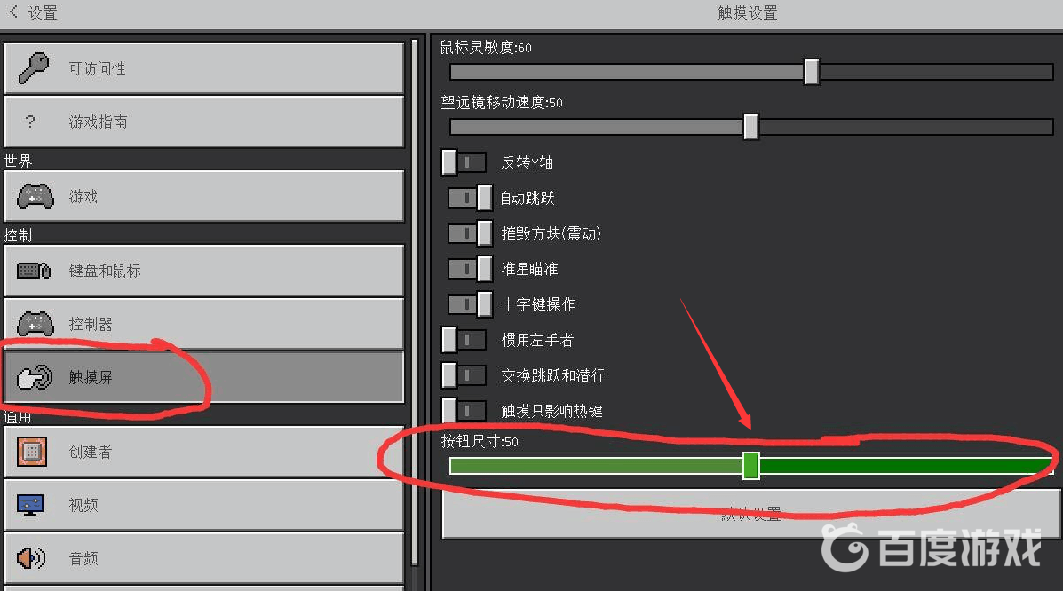 首頁 我的世界 問答 我的世界按鍵怎麼變大? 2022-12-30 1,首先我們進入遊戲主界面,按下ESC進入設置,點擊左側設置按鈕。2,然後點擊左側觸摸屏,就可以在右側的按鈕尺寸處調節按鈕大小了,玩家往右拖動就能使按鍵變大。