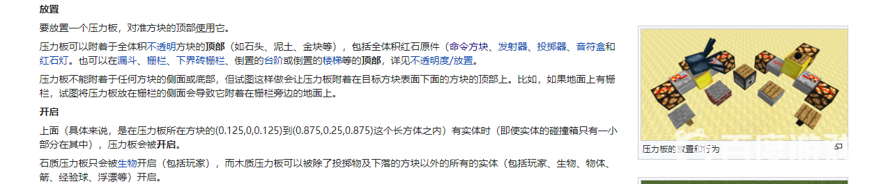 首頁 我的世界 問答 我的世界壓力板怎麼用? 2022-12-30 要放置一個壓力板,對准方塊的頂部使用它。壓力板可以附著於全體積不透明方塊的頂部(如石頭、泥土、金塊等),包括全體積紅石原件(命令方塊、發射器、投擲器、音符盒和紅石燈。也可以在漏斗、柵欄、下界磚柵欄、倒置的台階或倒置的樓梯等的頂部。