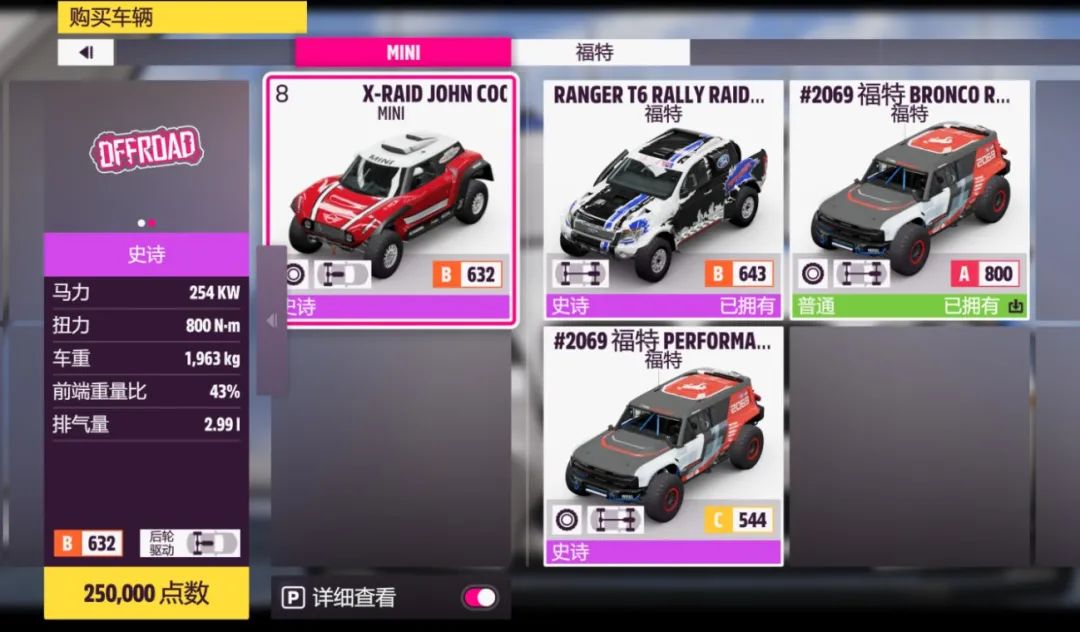 整個車展就沒有幾台越野車,再從性能和造價考慮,最後改了台福特 RANGER T6來應付,零件基本主打動力推進。實際上玩賽季遊樂場時哪怕你沒有合格車輛,都可以租用系統的車子比賽,以下建議僅供參考