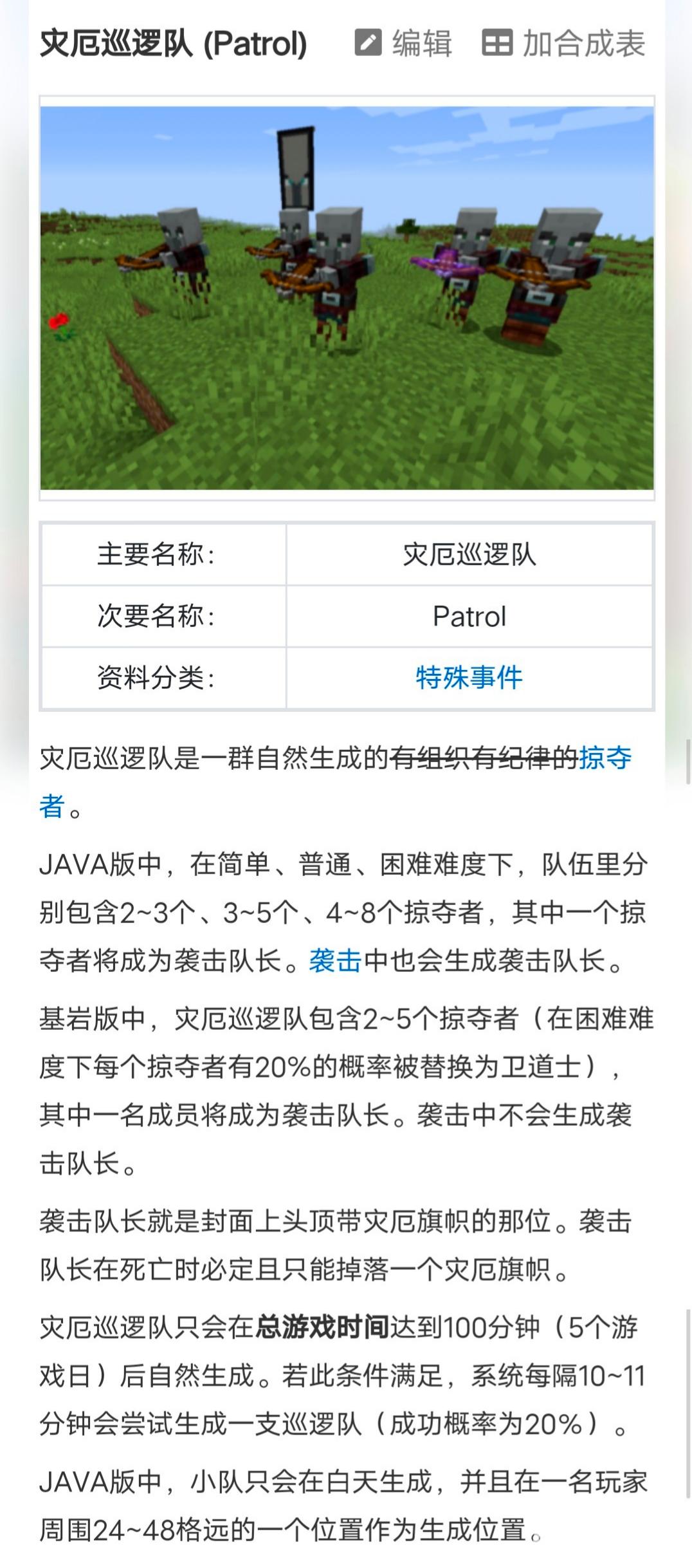 首頁 我的世界 問答 我的世界災厄巡邏隊生成條件是什麼? 2022-12-30 達到100分鍾即可自然生成。災厄巡邏隊只會在總游戲時間達到100分鍾(5個游戲日)後自然生成。若此條件滿足,系統每隔10~11分鍾會嘗試生成一支巡邏隊(成功概率為20%)。