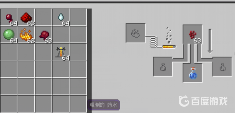 首頁 我的世界 問答 mc粗製藥水怎麼做? 2022-12-30 粗製的葯水可以用地獄疣 水瓶來合成獲得。地獄疣只能在地獄中獲取,而水瓶就是裝滿了水的玻璃瓶,將沙子放進熔爐里燒可獲得玻璃,再用3個玻璃合成玻璃瓶後對准水源裝滿水,便可以獲得水瓶。