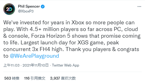 他還表示團隊多年來為Xbox付出的努力,就是為了能讓更多的玩家加入進來,現在實現了。菲爾·斯賓塞也在推文中表達了對玩家的感謝和對製作這款遊戲的Playground Games工作室的祝賀。