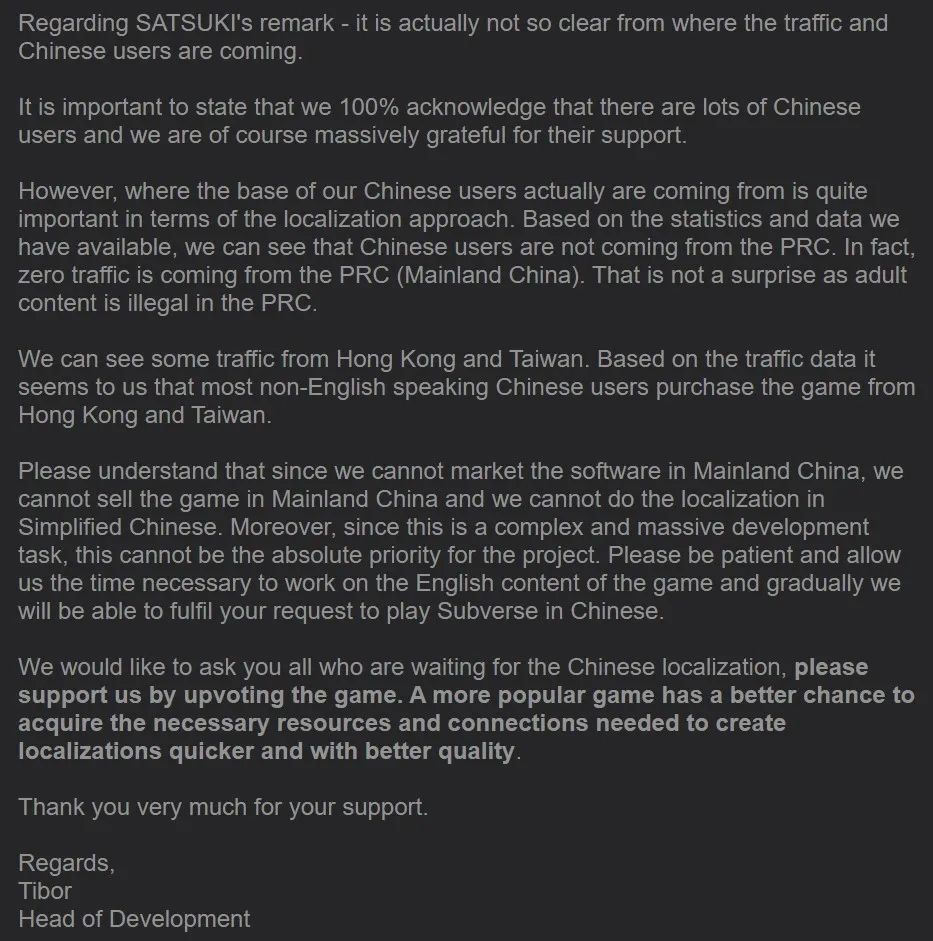 馬頭社承認有很多中國用戶,也感謝中國用戶的支持,但根據馬頭社的統計數據,中國用戶並非都來自中國大陸,而是來自香港和台灣,大多數非英語的中國用戶是從香港和台灣購買游戲的。目前馬頭社還是准備先把游戲的後續內容做好再考慮本地化的問題,馬頭社認為這是最佳的處理方式,並不會使游戲陷入麻煩。馬頭社希望所有等待中文本地化的朋友們,更多地支持《Subverse》,升級這款游戲。一個更流行的游戲有更好的機會獲得必要的資源和連接需要創建更快和高質量的本地化。