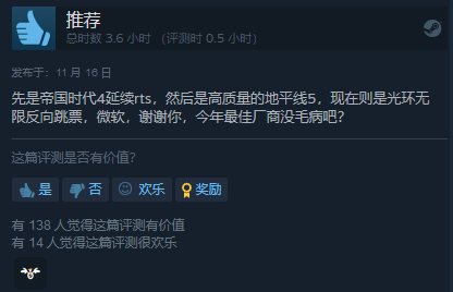 今日(11月16日),微軟旗下343 Industries工作室製作的FPS遊戲《光環:無限》多人模式免費Beta測試已在包括Steam在內的各大平台上線,而其戰役模式將作為DLC售出,國區售價為248元,支持中文字幕及配音,截止到發稿,共有3624個評價,好評率為72%,綜合評價為「多半好評」。