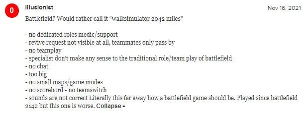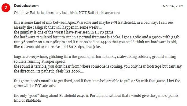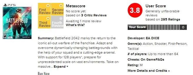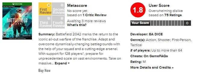 近日,《戰地2042》正式開啟搶先體驗模式,這款遊戲的正式版將在19日發布,目前該作多數媒體評分已經解禁,IGN打出了中規中矩的7分,而Metacritic網站上媒體綜合評分也在中等偏上的76分,同樣是在Metacritic網站的用戶則並不是這麼認為的。
