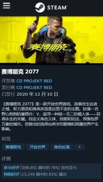 不知道是不是Steam秋季特賣的半價促銷給了《賽博朋克2077》一次新生,還是開發商在遊戲上市後長期的修補終於讓玩家感到了來自他們的誠意,這兩天開始在Steam平台上出現大量玩家對《賽博朋克2077》的「好評轟炸」,使得目前Steam對這款遊戲的評價達到了「特別好評」。