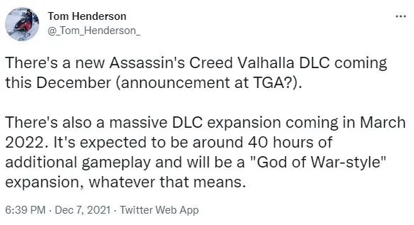 知名爆料人Tom Henderson發推文稱,《刺客信條:英靈殿》一款新DLC(可能在TGA上公布)將於今年12月推出。還有另一款大型DLC將於2022年3月推出,提供新可玩內容,類似於《戰神》風格,具體情況未透露。