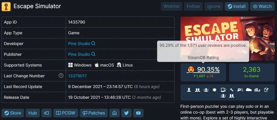 於10月19日上架Steam的,由 Pine Studio 開發、發行的《Escape Simulator》是一款密室逃脫類解謎游戲,由SteamDB數據不難發現,發行至今仍有著95%的Steam好評率,可謂備受喜愛。