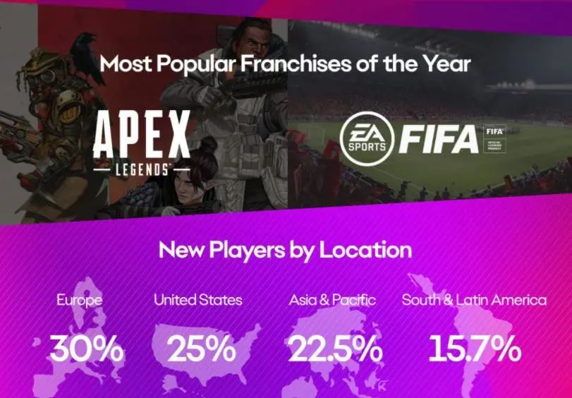 EA今年玩家社區新增超百萬人,大多數來自歐洲(30%),其次是美國(25%)、亞太地區(22.5%)以及南美洲和拉丁美洲(15.7%)。