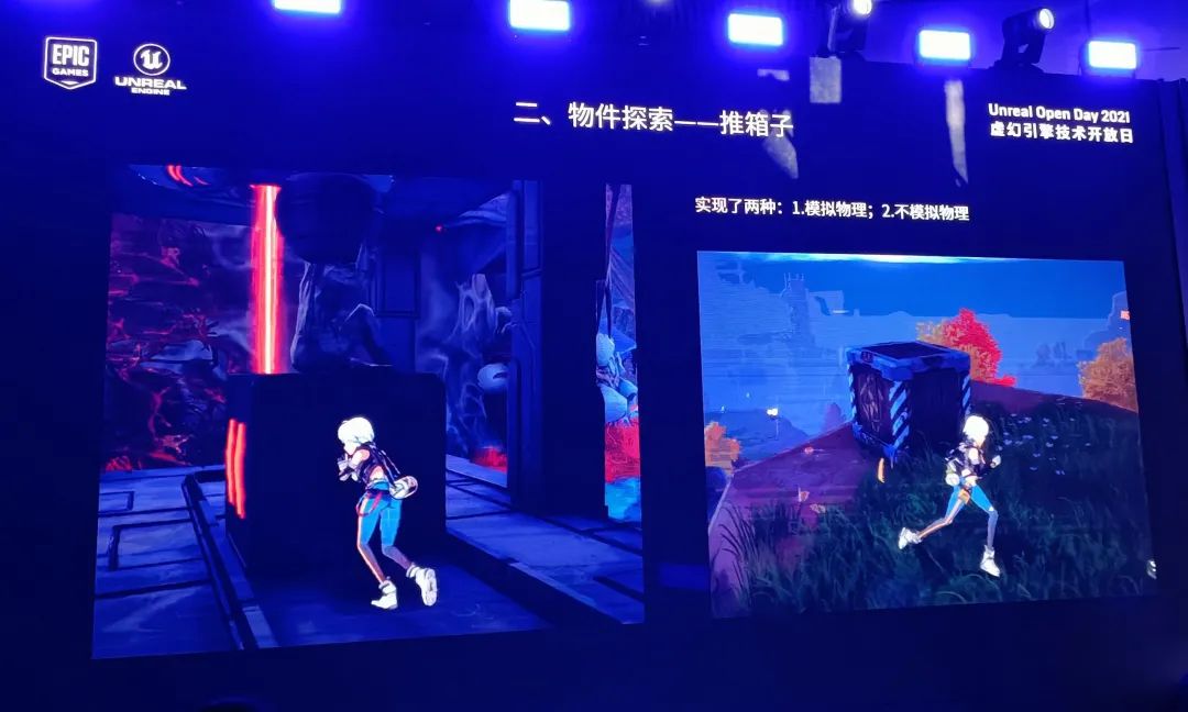 特別是在一些玩法的層面,左邊這是一個激光,我要把箱子推到那個地方才能打開機關,但如果是用模擬物理的箱子,可能我每推一次結果就不一樣,就完成不了。