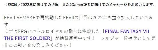 4Gamer詢問北瀨佳范對2022年的期待是什麼,他表示《最終幻想7重製版》重啟的《最終幻想7》世界將在2022年繼續擴大,並簡要的提到了剛上線的手游《最終幻想7:第一戰士》。