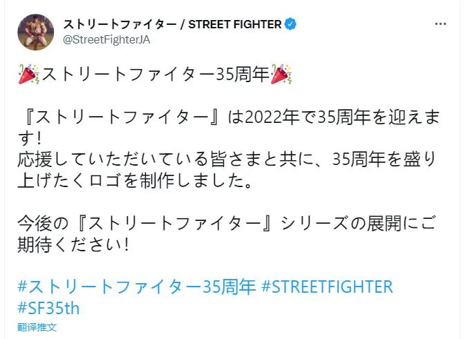 日本官推說:「街頭霸王將在2022年慶祝第35周年,我們製作了一個logo和支持我們的人慶祝第35周年。敬請期待《街頭霸王》系列未來的開發。」