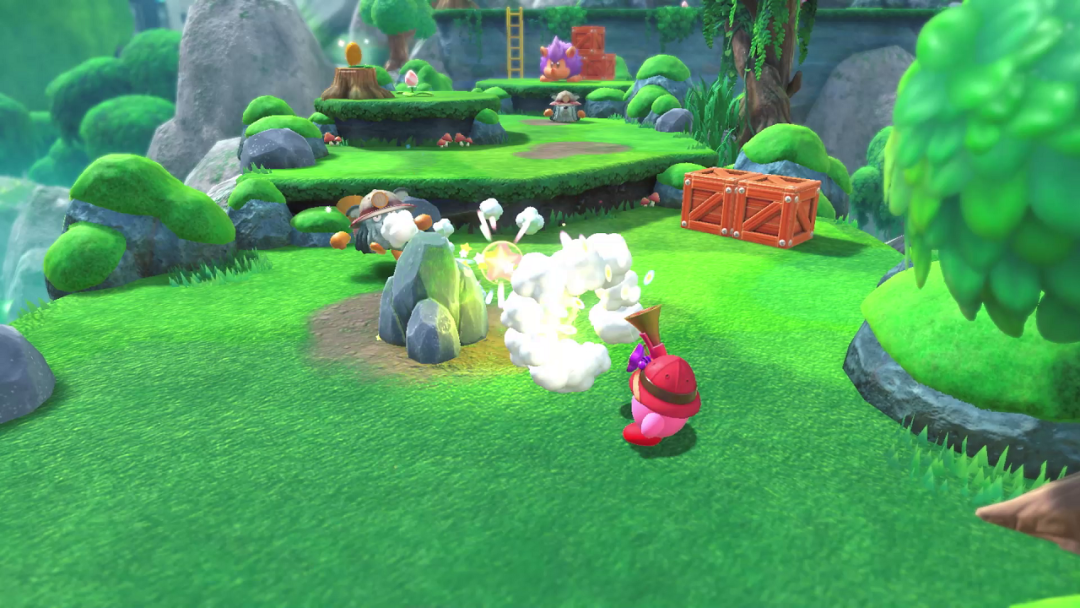 分享Joy-Con,使用卡比和頭巾瓦豆魯迪2人來進行冒險。頭巾瓦豆魯迪能使用槍發動各種攻擊,任何時候都能切換至2人遊玩。