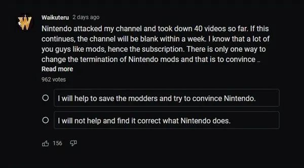 「到目前為止,任天堂攻擊了我的頻道並刪除了 40 個視頻。如果這種情況持續下去,該頻道將在一周內變為空白。我知道你們很多人都喜歡這個 MOD,因此訂閱了(我的頻道)。只有一種方法可以改變任天堂對於 MOD 的禁止態度,那就是說服任天堂,讓很多人來改變任天堂的觀點。目標是聚集足夠多的人讓任天堂願意聽到我們的聲音。」