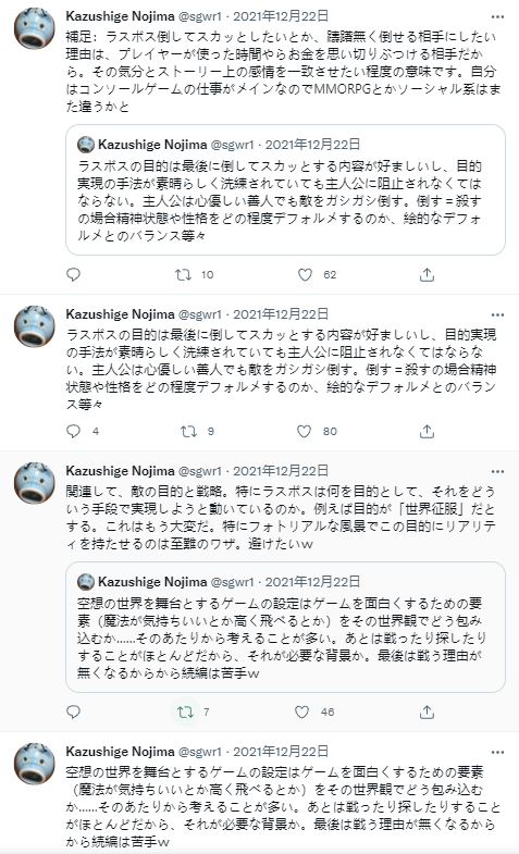 隨後野島一成補充到自己不會停止使用社交媒體的。他會繼續與大家分享自己飼養的豚鼠的照片,但他將不再談論自己所參與的特定游戲,比如《最終幻想7重製版》。