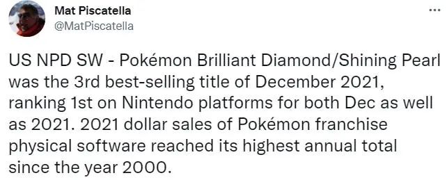 NPD集團是一家美國市場調查公司,執行董事Mat Piscatella曾在華納遊戲和動視任職。他在推文中表示:「(美國)《寶可夢:晶燦鑽石/明亮珍珠》是2021年12月第三暢銷的遊戲,在12月和2021年都是任天堂平台上的第一。2021年寶可夢實體軟體的美元銷售額達到了自2000年以來的最高年度銷售額。」