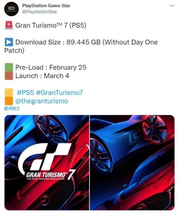 PS Store上線《GT賽車7》預購頁面,顯示安裝PS4/PS5《GT賽車7》需要110GB硬碟容量。同時推特用戶 PlayStation Game Size在今日通過訪問網頁後台數據顯示,《GT賽車7》實際只需要89.445GB的空間,官方公布的容量可能包括首日補丁,另外並得知遊戲將在2月25日開始預載。