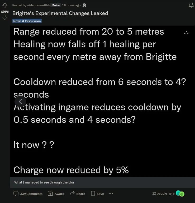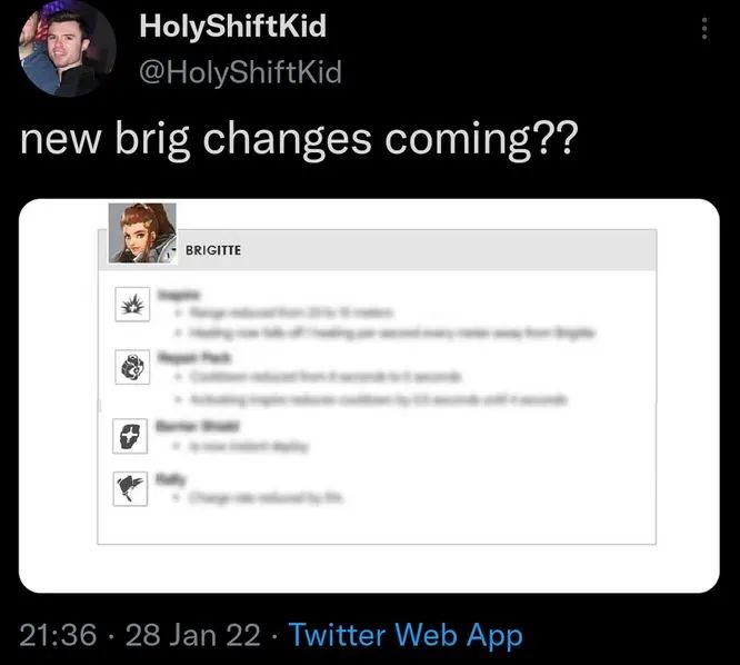 泄露來自推特用戶 HolyShiftKid,他分享了「布麗吉塔」即將發布的補丁說明,其中所有更改都模糊了。但對於網友來說,這種模糊對他們只是一種挑戰。Reddit 論壇用戶depressedtbh 發布了「布麗吉塔」改動列表,他們認為這是從推特上共享的打碼帖子中翻譯過來的。