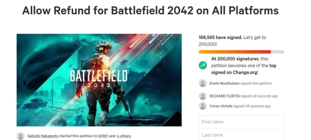 如今,退款請願簽名數已經輕鬆突破16萬,也讓這一請願成為Change.org上本年度最具人氣的請願之一。EA和DICE均未對這一請願和玩家的退款要求發表回應。雖然有報道稱Steam會給《戰地2042》玩家退款,但PlayStation和Xbox玩家由於嚴格的反退款條約限制,因而很難拿到退款。去年我們已經在《賽博朋克2077》上看到類似的情況,Xbox和PlayStation數字商店的玩家想要退款真的很不容易。