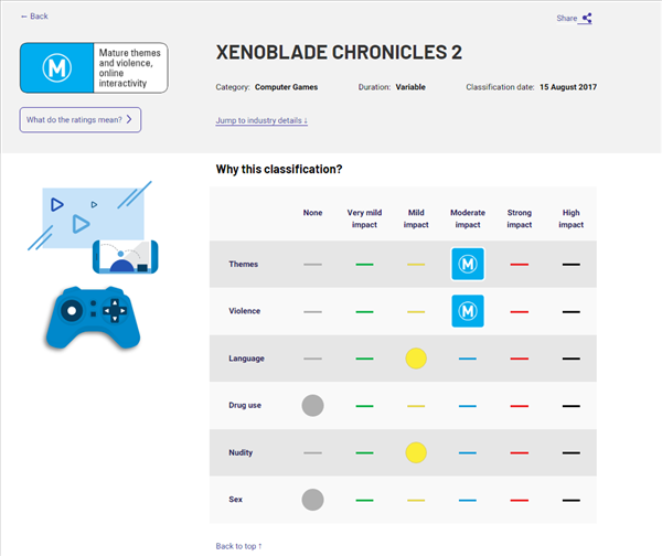 《異度之刃》系列新作《異度之刃3》確定將於今年9月正式發售,遊戲官網已上線,背景世界情報都已公開,今天(2月18日),有網友發現《異度之刃3》現已通過澳大利亞評級,遊戲定為M級,與前作《異度神劍2》定級細節沒有太大的區別,一起來看看吧!
