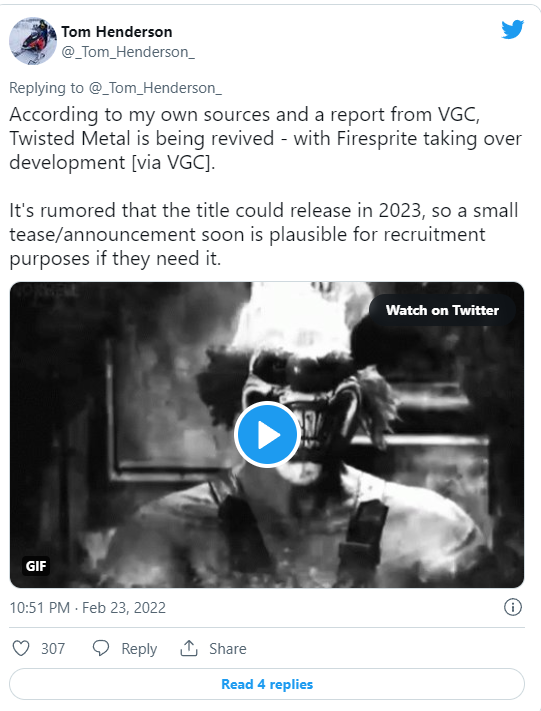 Tom Henderson發推說他聽到今年3月索尼將有一個PS發布會,展示的遊戲陣容包括華納兄弟的《霍格沃茲的傳承》,頑皮狗多個《最後的生還者》遊戲項目以及傳聞中的《烈火戰車》等。