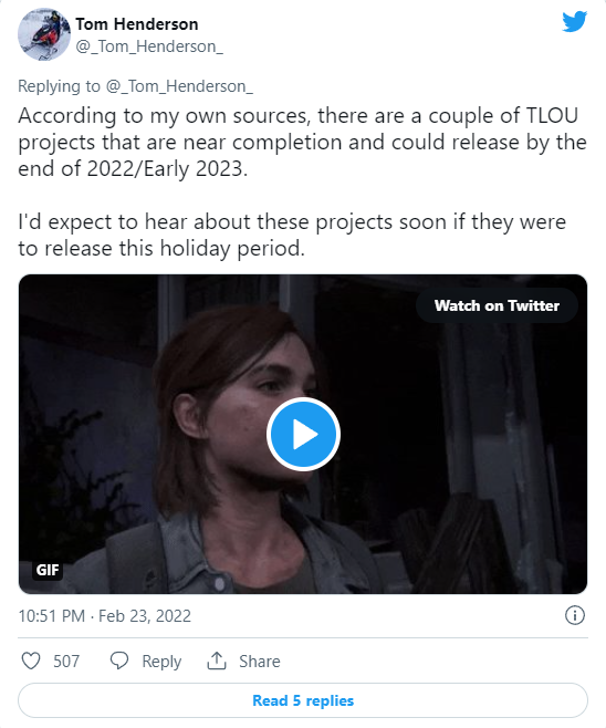 Tom Henderson:根據我的消息人士,頑皮狗有幾個《最後的生還者》項目快要開發完成,可能在2022年底或者2023年初發售。如果索尼計劃在今年聖誕假期發售它們,那麼我預計我們很快就會聽到這些作品的消息。