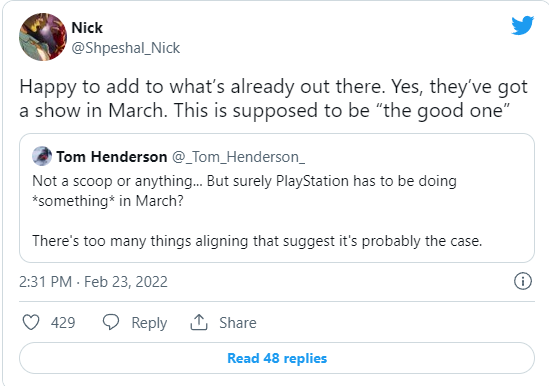 在社交媒體上,各路舅舅黨都在盛傳索尼將在3月舉辦PlayStation發布會的消息。消息最初來源於舅舅黨Tom Henderson,然後是Nick Baker跟進。他們稱索尼確實在籌劃這個活動,而且料很足。