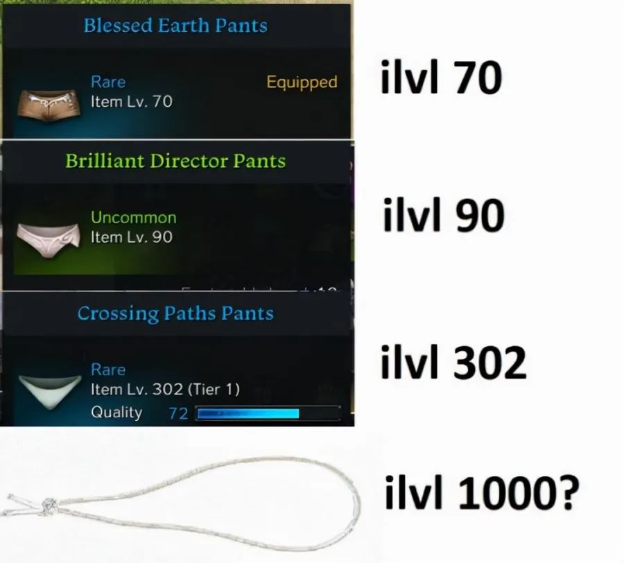 從上圖可以看到,角色在70級時,裝備是相對正常的熱褲;90級則是比基尼短褲;302級時,短褲所用到的布料就更少了。最後那個1000級的細繩則是來自玩家的惡搞。