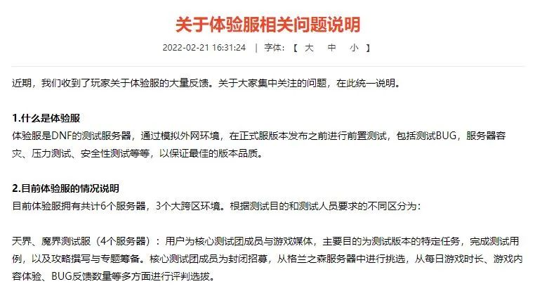 隨著「DNF體驗服亞姐事件」的不斷發酵,官方終於坐不住了。2月21日,官方發布了關於體驗服相關問題說明,正面回應了近期引發的一系列爭議,向玩家進行了道歉。