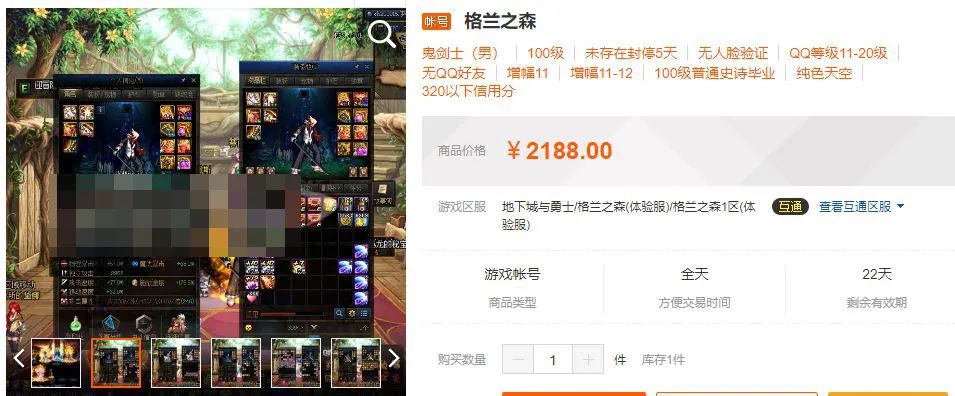在背後盤根錯節的黑商,與各方利益的糾纏下,格蘭之森測試服的賬號,已經成了市場上的香饃饃。某賬號交易平台里,增幅11的格蘭之森測試服賬號,可以賣到2188元的高價。