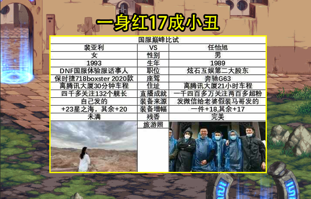 有人特意將體驗服的「一姐」裴亞利,與正式服的「一哥」任怡旭遊戲賬號進行了對比,任怡旭就是知名DNF主播旭旭寶寶,而這位名叫裴亞利的玩家,則是本次事件中的風雲人物「歐皇小亞」。對比不難發現,旭旭寶寶的賬號強度,明顯不如歐皇小亞,而歐皇小亞的這些高紅裝備,基本都是免費獲取的。