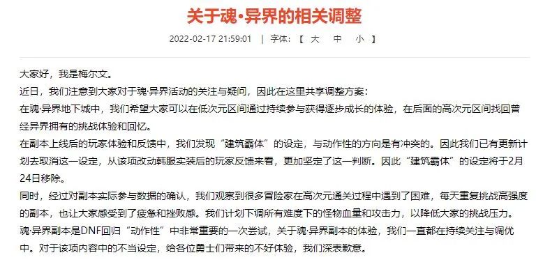 造成如今的局面,很難說不是DNF運營長期透支信用的結果。要知道,僅僅在這個月,DNF運營已經發了三封道歉聲明。就在2月17日,官方剛剛因「魂·異界」副本,向玩家進行道歉。