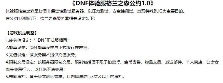 2月24日,面對眾多玩家的聲討,官方發布了最新的「關於格蘭之森的後續管理說明」,再次向玩家進行了道歉。這份聲明附帶了一份《DNF體驗服格蘭之森公約1.0》,明確測試服不提供充值服務,杜絕不法交易,疲勞值與正式服相同,並且,承諾每年會進行3次及以上清檔。
