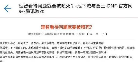 就在玩家不滿情緒不斷蔓延之際,8月26日,DNF運營發布了一篇名為「理智看待問題就要被噴死」的公告,這無疑是在火上澆油,玩家還發現,作者在文章中發布的遊戲裝備截圖是P的,一時間群情激奮。很快,官方刪除了這篇文章。但玩家的怒火,已經無法安撫了。