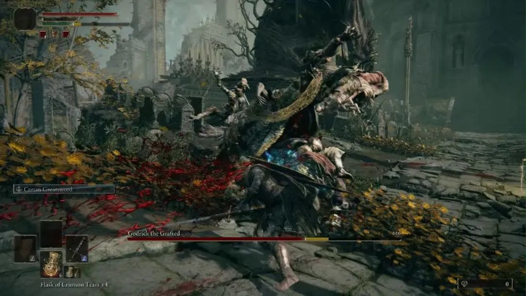 從惡兆的賜福點往前來到史東薇爾正門,此時有兩條路線,一條是從正門旁的一條小道繞一大段路來到升降機旁房間,另一條是和旁邊房子裡的npc對話,從大門跑酷直接就能到升降機旁房間的賜福點,坐電梯上去直接就是葛瑞克的boss戰。因為按正常流程到這裡玩家等級已經提高很多了,所以這場戰鬥和惡兆比要簡單不少,一階段轉二階段cg之前,二階段開始的噴火都有不少的輸出時間。