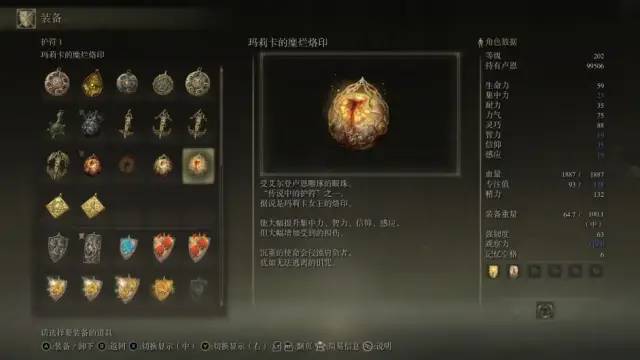 瑪麗卡的糜爛烙印:在聖樹底層瑪蓮妮亞boss房旁邊的門出去到房簷上蹲下,等黃金樹化身走遠後跳到底下的平臺,需要使用一把石劍鑰匙開啟霧門,從寶箱獲得,注意躲避下層兩只精英怪的攻擊。