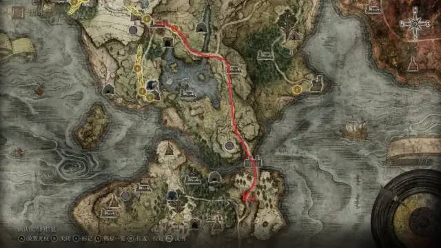 依次從圖上四個點到達王城城牆前方,途中會經過雙大樹守衛,石像鬼,惡兆boss戰,都可以跳過。需擊敗城牆前的龍裝大樹守衛才能進入王城。接著向裡走,從城牆上右邊第一個缺口往下跳,直走下電梯,在第二個房間樓梯後的門外跳過欄桿來到王城地面,沿著大道走會看到一隻黃金樹化身,繞過化身在右邊就能找到露臺賜福。從賜福處下樓梯到龍翼上,沿著右邊一塊突起就能到達對面的城樓。接著一直往前走繞過石像鬼上樹枝,左走就能到葛孚雷的boss門口。注意打完後從賜福點左側坐電梯到下層,跳到長槍雕像上能獲得一把傳說武器,打完黑劍後王城地圖改變就不能再獲得了。