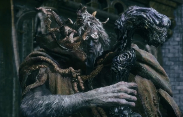 從祖靈之王角後一條小路進入導水橋,導水橋盡頭的一片開闊區域就是雙石像鬼。擊殺後找到賜福旁的棺材可以到達深根底層。究極換皮怪之一,這裡兩只,王城兩只,野獸神殿一隻,雪山一隻,然而這兩只是血量最少的。