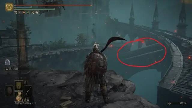 從紅狼賜福點左門出,踩石柱沿著石橋就能來到boss門前的電梯。路上會遇到會卡利亞大劍和彈反處決的npc入侵。