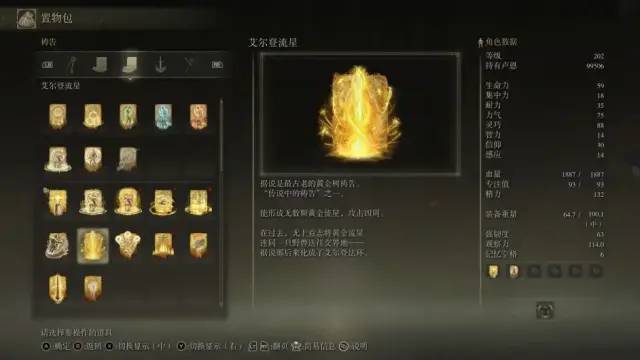 艾爾登流星:在深根底層的大瀑布頂端,沿樹枝進入螞蟻洞,在螞蟻洞出口獲得。