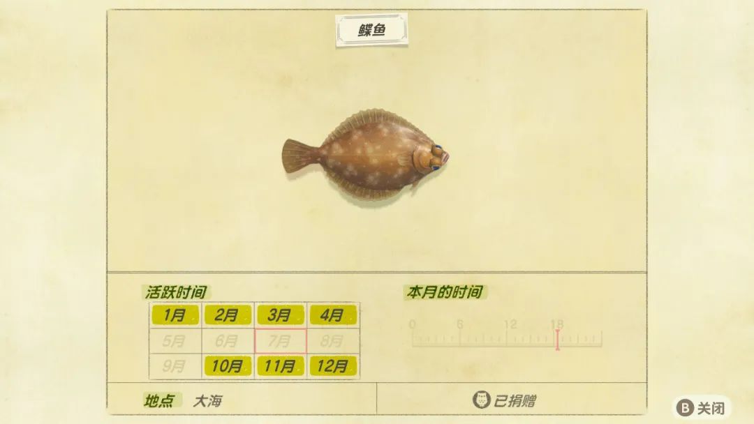 26、比目魚 | 賣價:800 | 棲息地:大海 | 魚影:大型 | 時間:全天