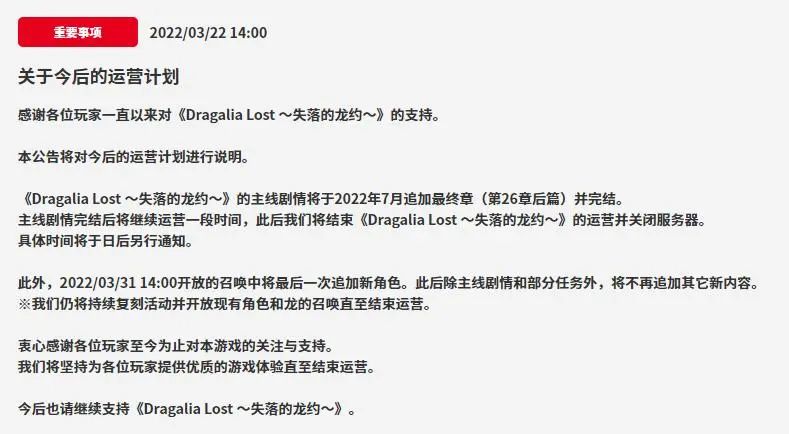 在這份「今後的運營計劃」公告中,官方表示《失落的龍約》主線劇情將在2022年7月追加最終章(第26章後篇)並完結,在此之後遊戲將繼續運營一段時間,隨後官方將結束遊戲運營並關閉伺服器,具體關服時間另行通知。