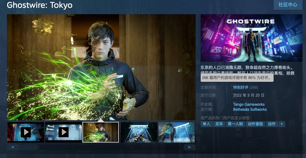 《幽靈線:東京》已於今日(3月25日)正式發售,截至發稿,該作在Steam的玩家口碑為特別好評(266篇評測中有86%為好評)。