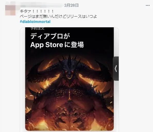 在Twitter上,以《暗黑破壞神:不朽》的英文名為關鍵詞進行檢索,便可以搜索到大量全球各地玩家分享的預約推文。除了歐美語系的玩家,甚至還能看到日本、韓國、東南亞、中東等各地區玩家不同語言的預約信息。而這些不同語言,傳遞出的都是相同的情緒——欣喜若狂與迫不及待。
