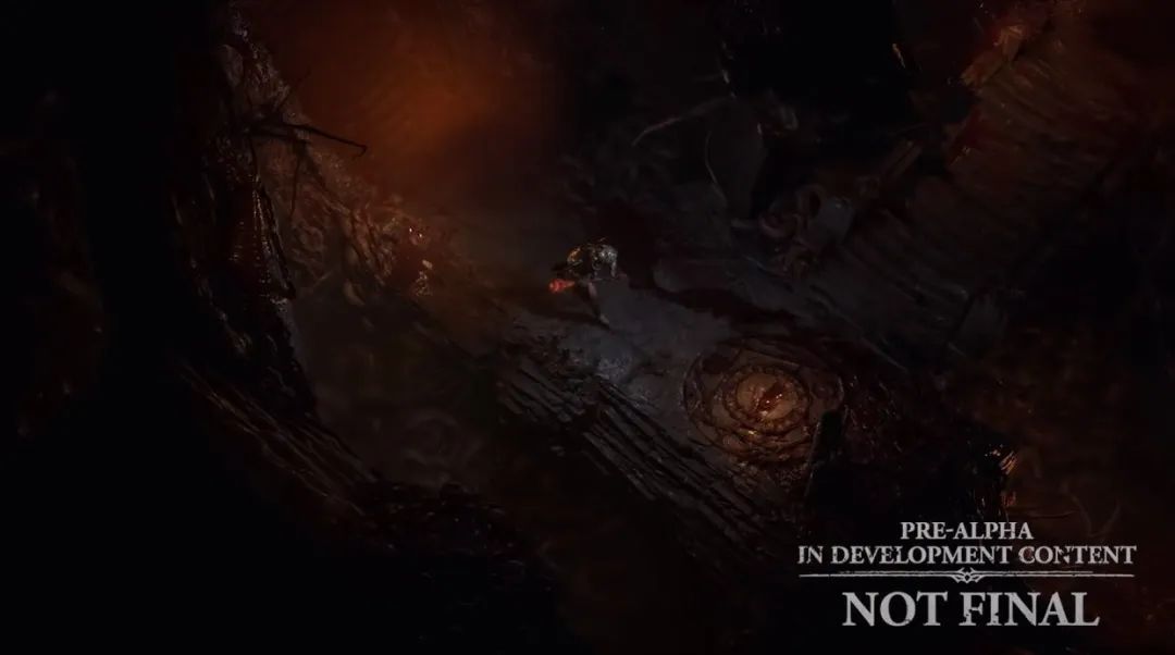Ben Hutchings:從這個部分,我們能夠清楚看出《暗黑破壞神4》的「重返黑暗」設計主軸。我們的目標是引領玩家在地城裡前進,同時呈現出怪誕詭異的東西。在這種類型的地城中,我們會著重於玩家空間的剪影,替遊戲場景營造出具有規模和深度的感覺,這樣能夠讓畫面變得更清晰,協助玩家探索環境,同時又能夠展現出遊戲環境那種寬敞廣袤的特性。