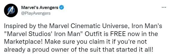 據《漫威復仇者聯盟》的推特賬號稱,該游戲現在將免費提供鋼鐵俠的MCU服裝。這套西裝採用托尼·斯塔克標志性的紅色和金色裝飾,直接受到漫威電影宇宙開山之作《鋼鐵俠》的啟發,由小羅伯特·唐尼飾演。